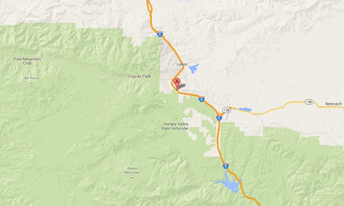 Here are the communities in our Mountain area which is focus of the historical fiction videography "The Coming of Aspalt." The red "A" is location of the Tejon Pass, the subject of the "Freeway" section. Tejon Ranch is to the west of I-5 and north of 138. Windwolves Preserve is north of Pine Mountain Club and is the location of the historical El Camino Viejo route. The water mass to the south is Pyramid Dam area. The green area is the Los Padres National Forest.