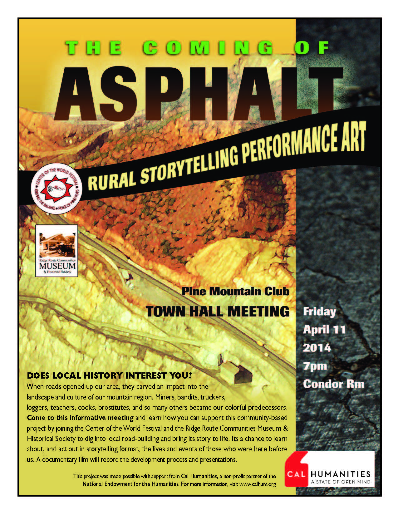The Center of the World Festival, in collaboration with Ridge Route Communities Historical Society and Museum, has received a generous grant from CalHumanities targeted toward creating a documentary video of our area’s cultural history. We are contacting all Frazier Mountain organizations asking for help in producing this project. We hope your organization will participate.
